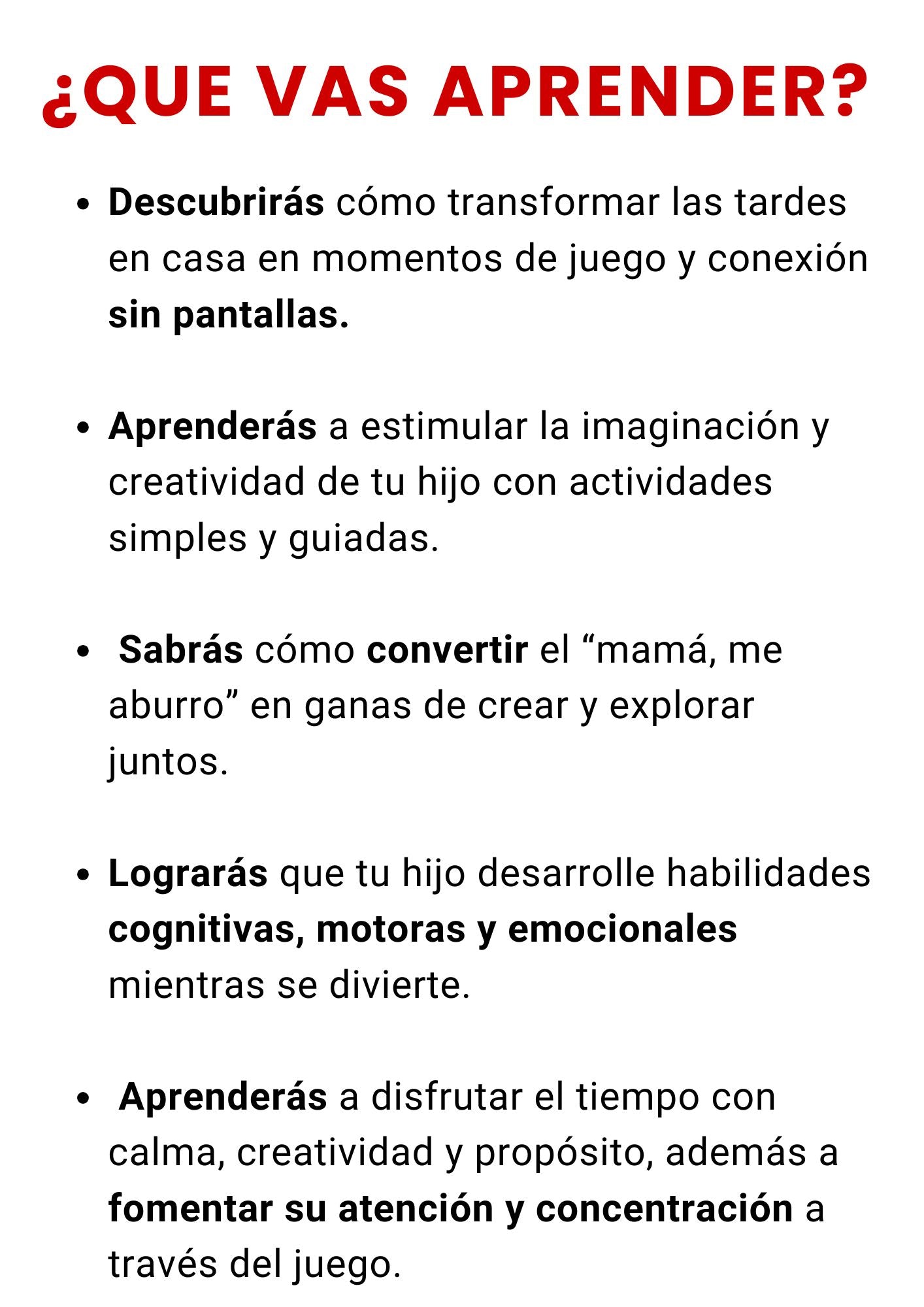 Cada actividad viene con instrucciones claras, fotos y guías paso a paso. Vos solo poné la intención; nosotros te damos la inspiración. En pocos días vas a descubrir que la creatividad también se entrena (y se disfruta).