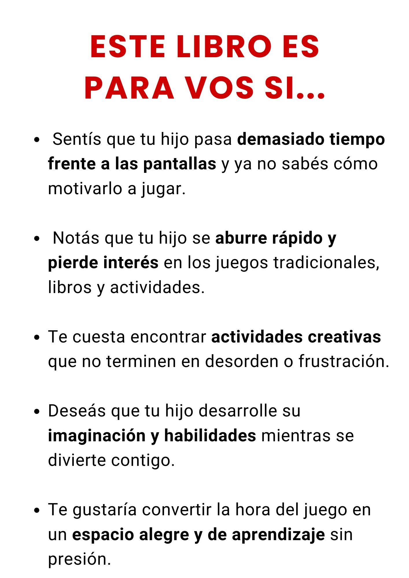Cada actividad toma entre 10 y 20 minutos — el tiempo justo para reír, crear y conectar, incluso en días caóticos. Porque no se trata de cuánto tiempo pasás con tu hijo, sino de cómo lo compartís.